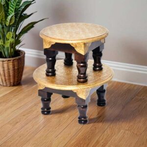 Brass Chowki Set of 2 Wooden Round Bajot Traditional Pooja Chowki Set for Pooja God Sitting Stool Indian Brass Chowki Pooja Stool puja Table